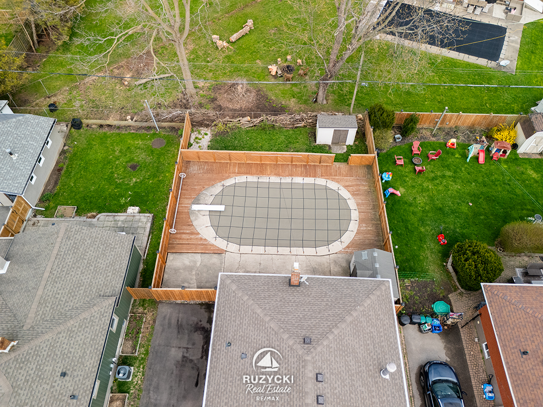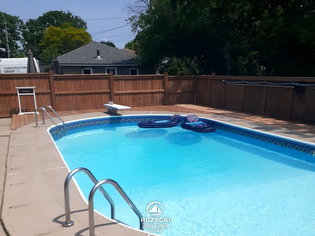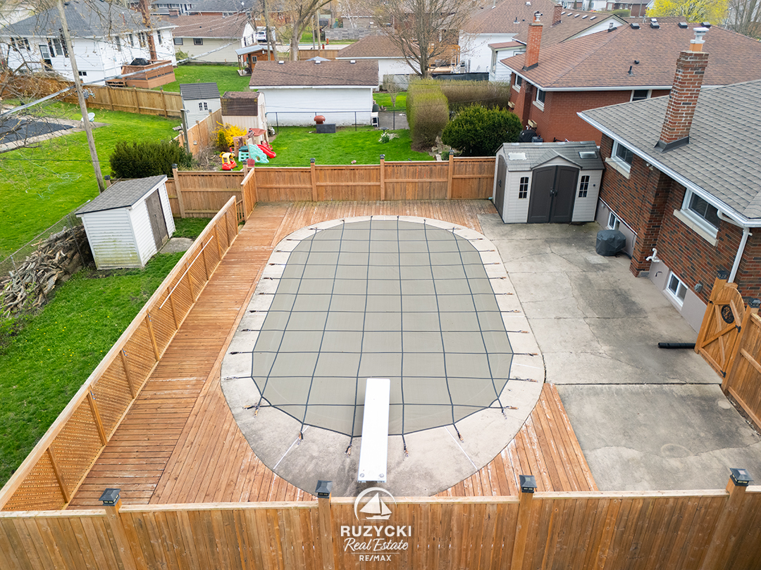 Saving the best for last – the back yard is fully fenced yard and features a 16′ x 32′ inground pool, a sunny patio, deck area, and two handy storage sheds.