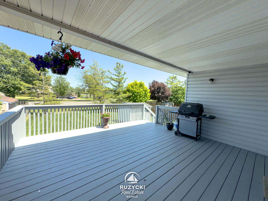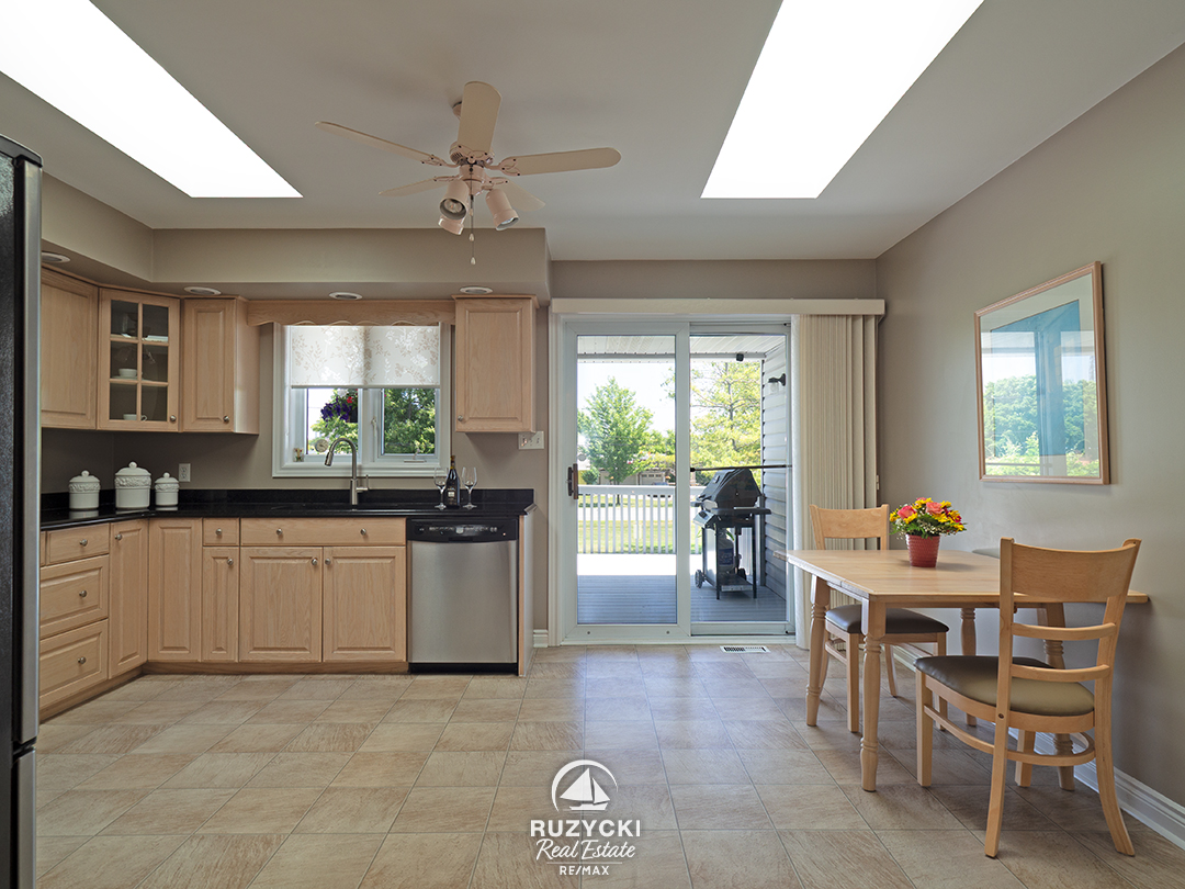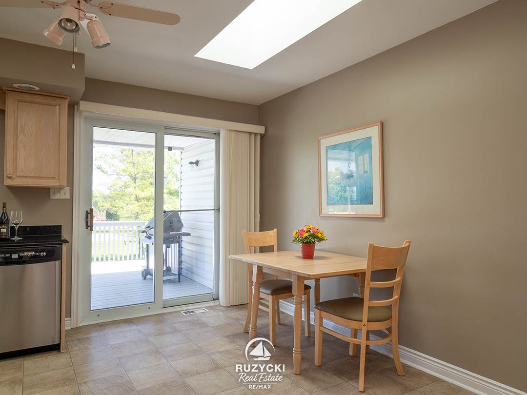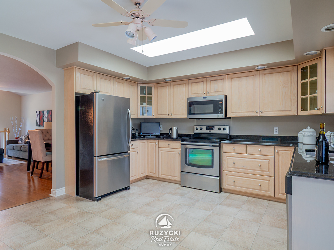 The main level features an open-concept living and dining area with hardwood floors and a large eat-in kitchen complete with granite counters, plenty of cabinetry, and two skylights that fill the space with natural light. Patio doors off the kitchen lead to a spacious, partially covered back deck that offers a great spot for outdoor dining or relaxing while overlooking the backyard.