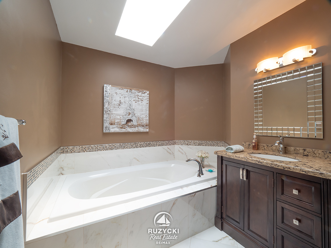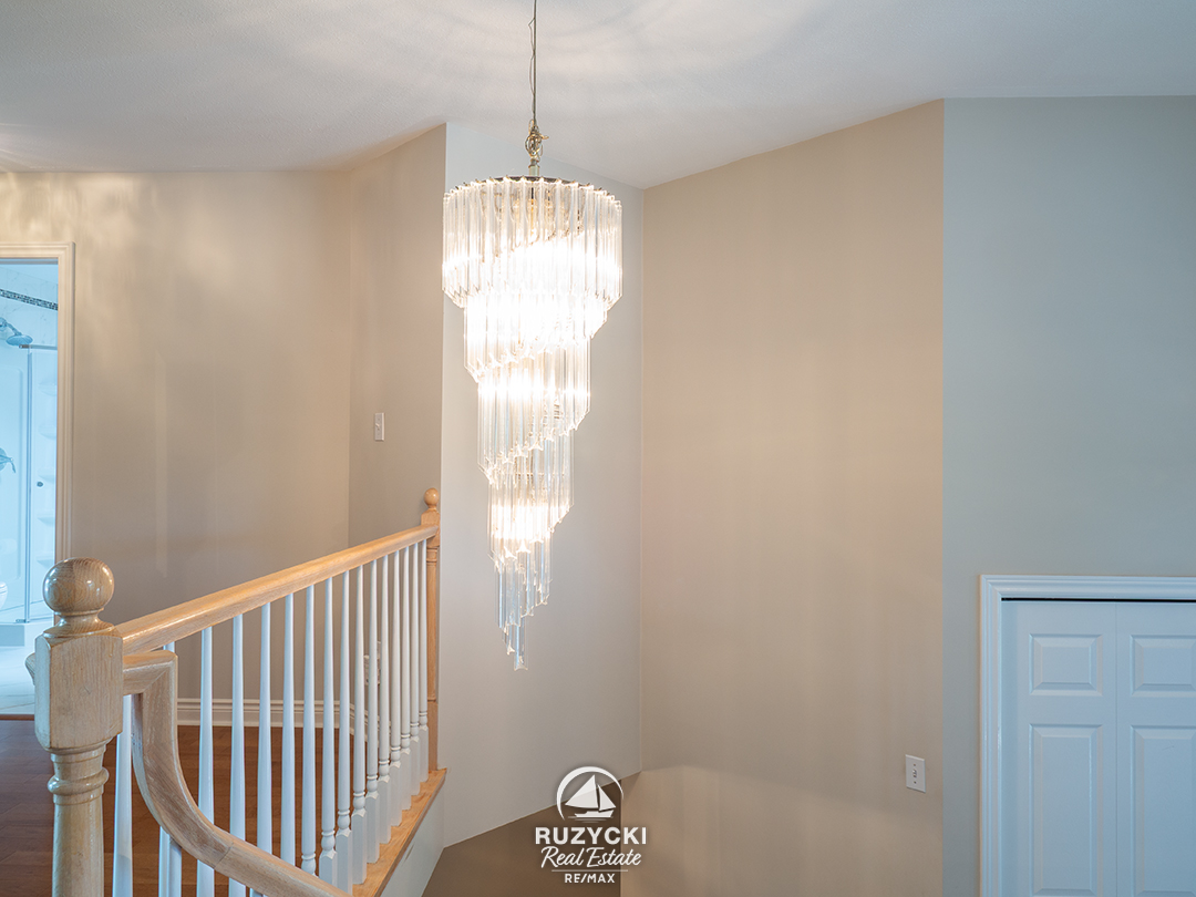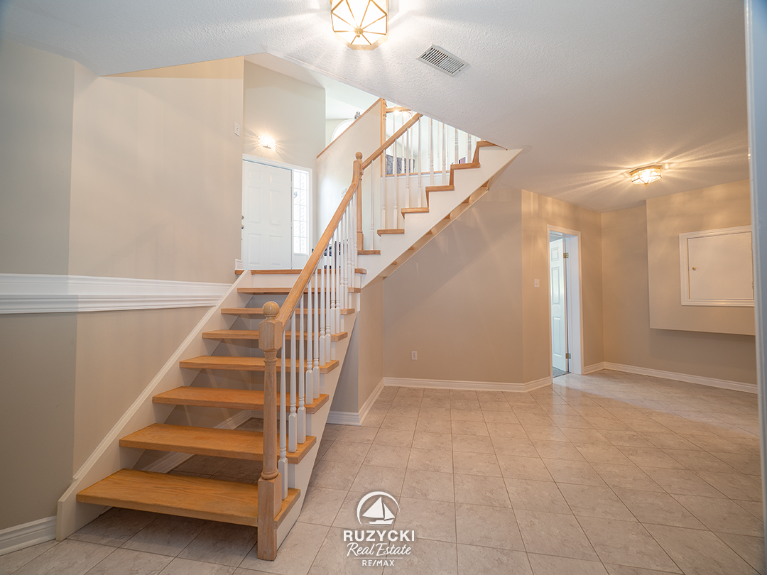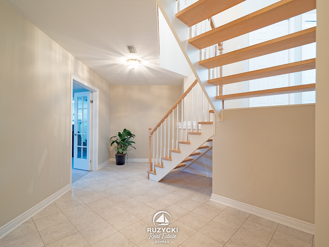 Situated on a 50′ x 137.5′ lot with no rear neighbours, the home is set back nicely with landscaped front gardens and a tranquil pond feature that welcomes you to the front door. A bright two-storey foyer and open staircase create an impressive entry hall.