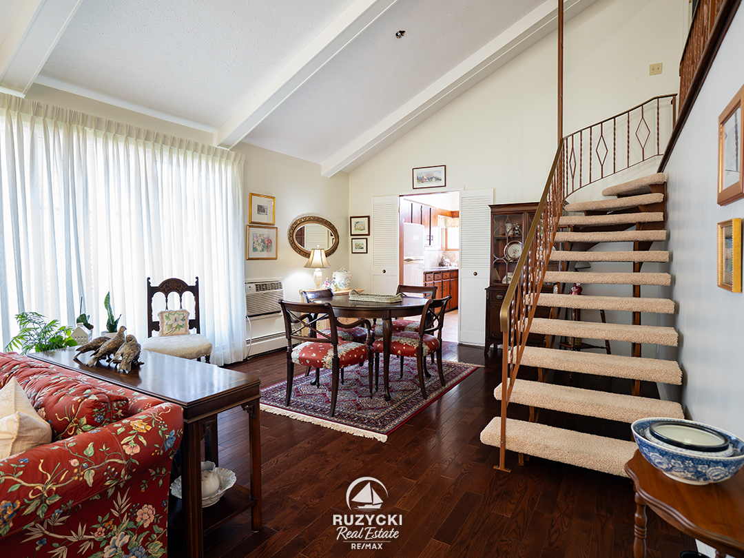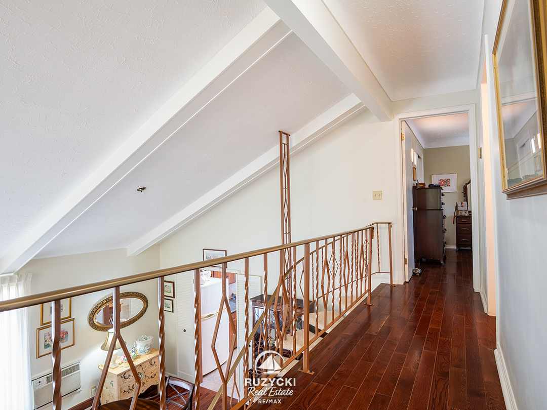 Upstairs, the 3 bedrooms include a large primary bedroom includes a private ensuite. An iron railing along the upper hallway overlooks the living room, adding openness and character.